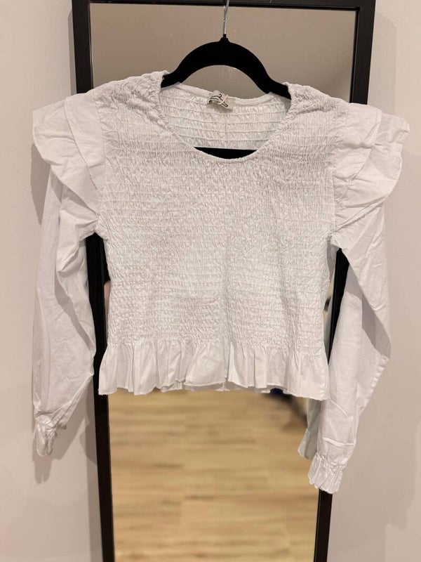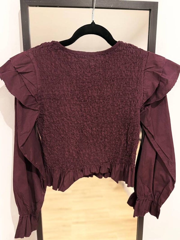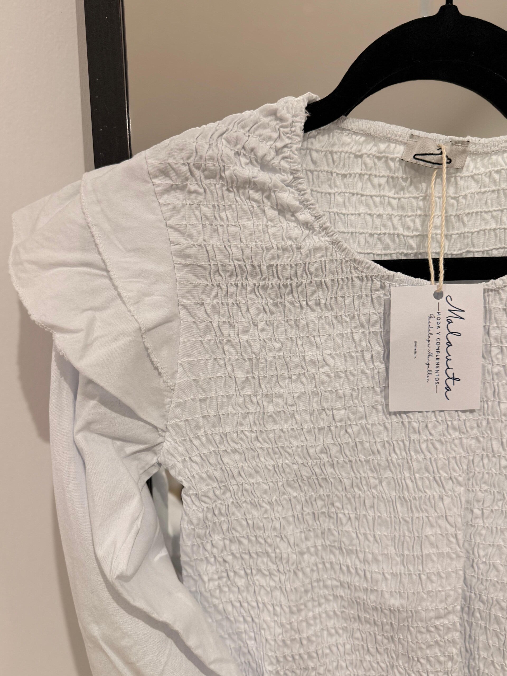 Blusa con cuerpo fruncido y volantes en hombros y bajo. Tejido ligero y femenino, perfecta para looks casuales o elegantes.