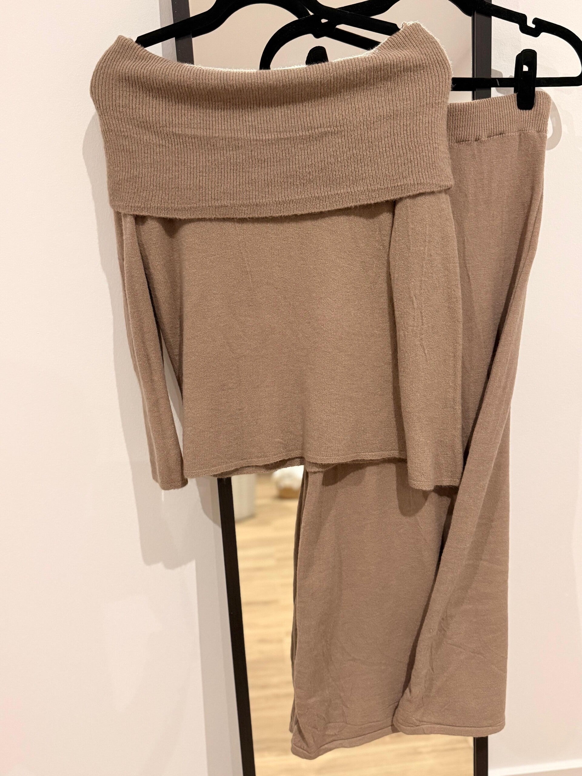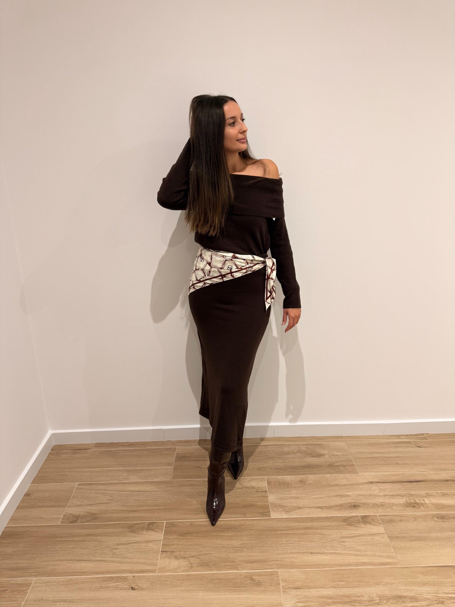 Conjunto de punto suave compuesto por suéter de escote bardot y falda midi ajustada. Un diseño cómodo y favorecedor que realza la figura sin renunciar al estilo. Ideal para tus looks de diario o una cena especial. Disponible en color marrón y beige.