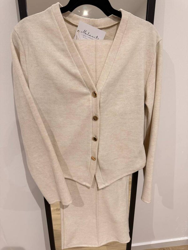 Conjunto de suéter y pantalón de punto suave. Diseño cómodo y elegante con botones dorados y corte minimalista. Perfecto para un look relajado pero sofisticado.