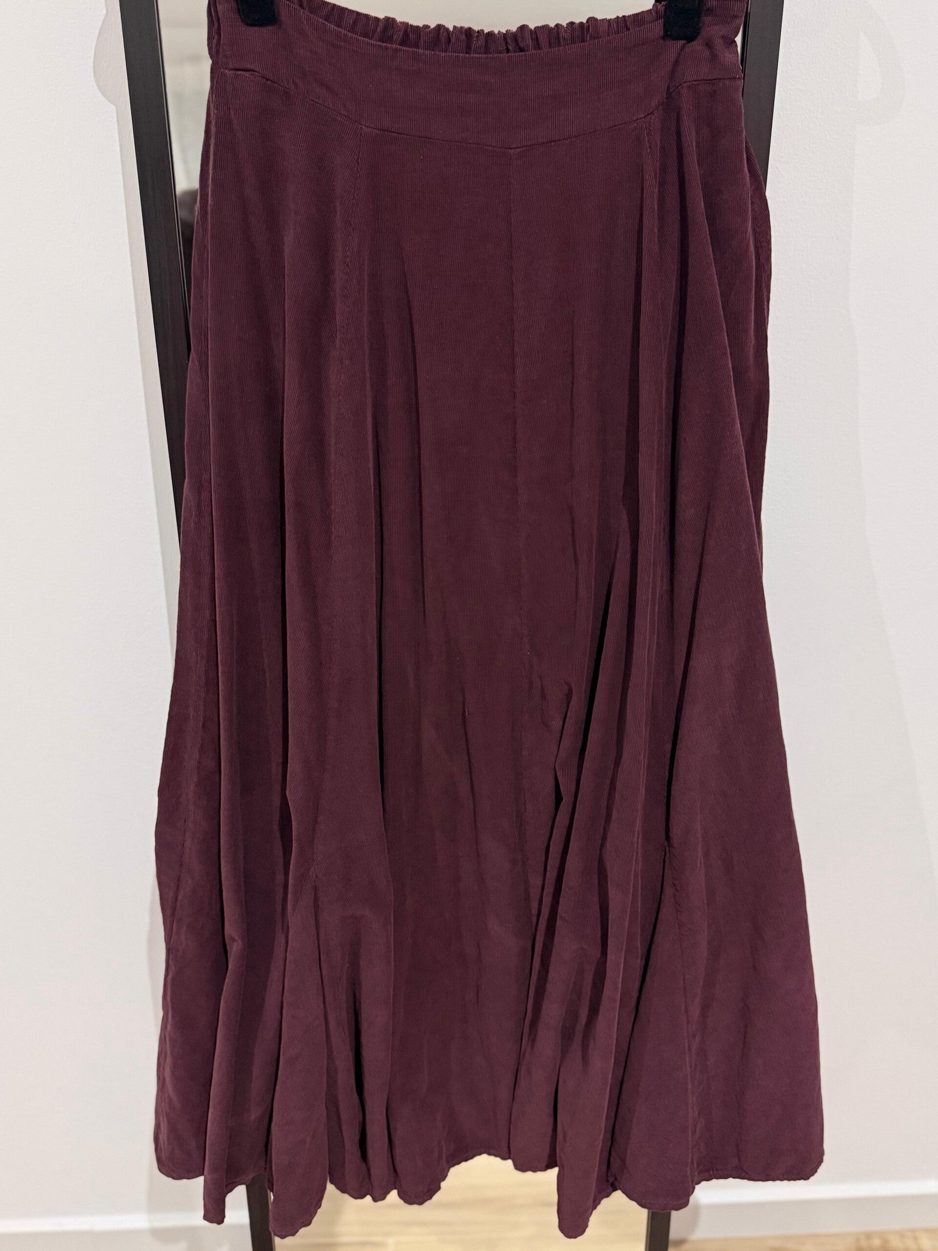 Falda midi de pana ligera color burdeos. Cintura elástica para mayor comodidad y caída fluida que aporta movimiento y elegancia. Perfecta para combinar con suéteres o blusas en looks otoñales y casuales.